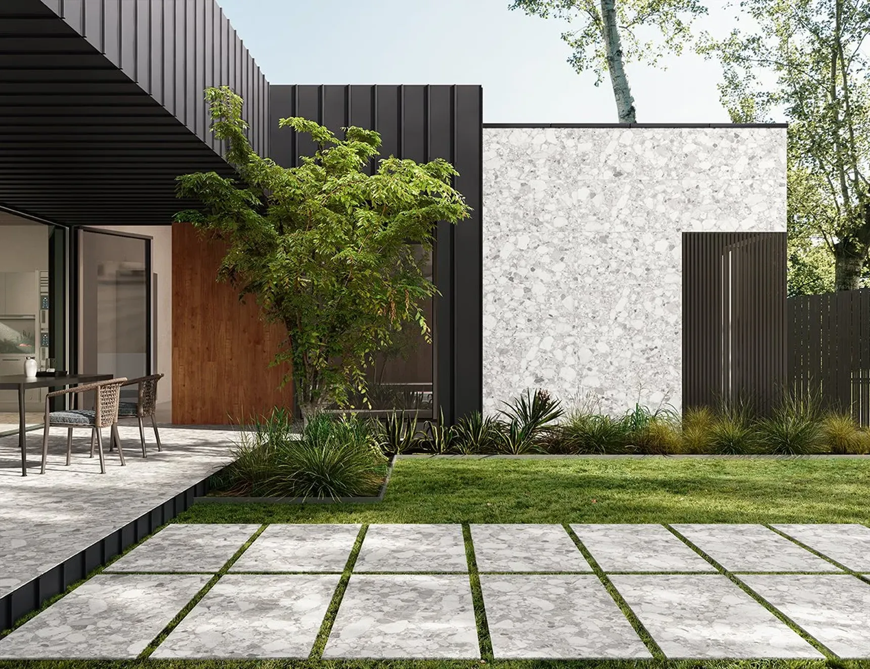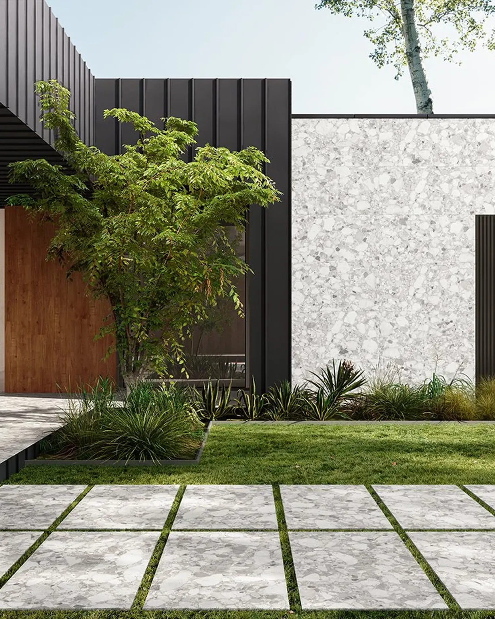 Met staptegels kan je ook een brede rand creëren tussen de gevel van je woning en de beplanting rondom. Zo kan je vlot je ramen poetsen zonder dat je je daarvoor een weg hoeft te banen door je dichte planten tegen het huis.