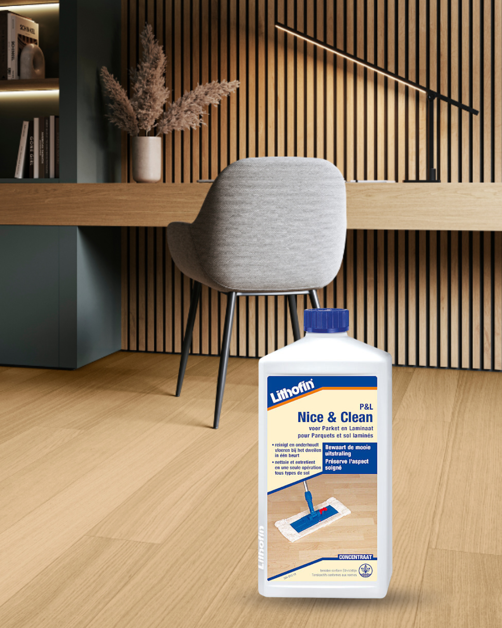 Geen allesreiniger of agressieve producten, maar een schoonmaakmiddel dat speciaal ontwikkeld is voor parket. Zo tast je de beschermlaag niet aan en blijft het hout in optimale conditie.